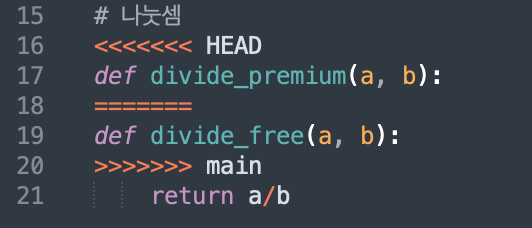 내용이 divide_premium, divied_free로 각각 달라서 어떤 내용으로 합쳐야 할지 몰라 컨플릭트가 발생한 것이다.