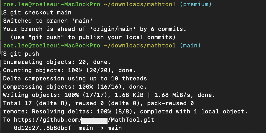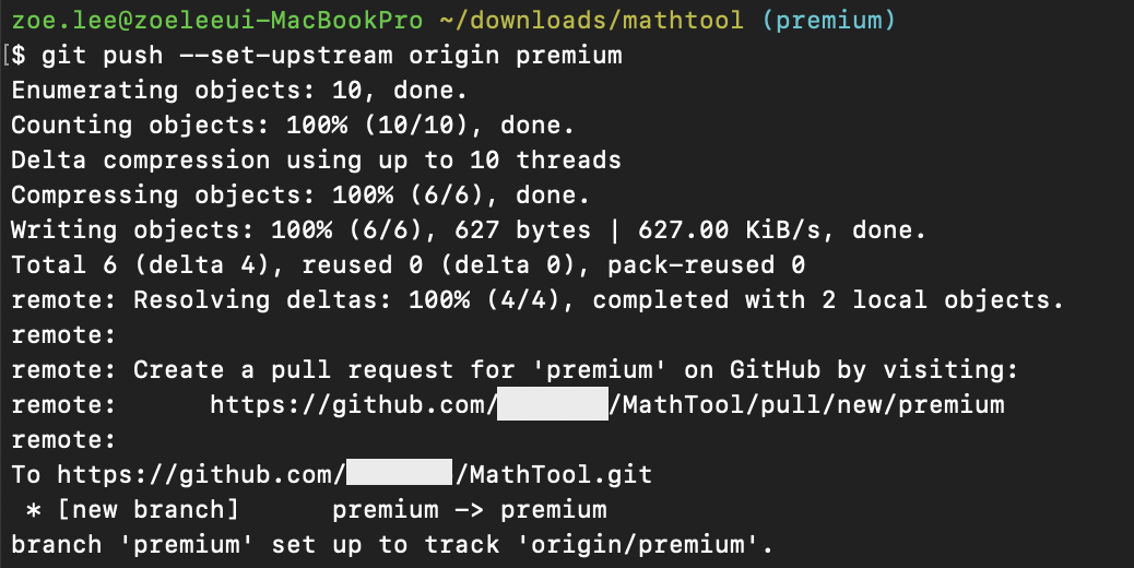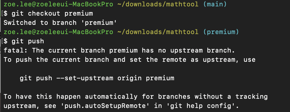 프로젝트는 이미 업로드가 되어 있지만, 프리미엄 브랜치를 이용해서 리모트 레포지토리로 옮기는 것은 처음이기 때문에 이러한 메세지가 출력된 것이다. 이렇게 새로운 브랜치로 첫 push를 할 때에는 아래와 같은 커맨드를 사용해주어야 한다.