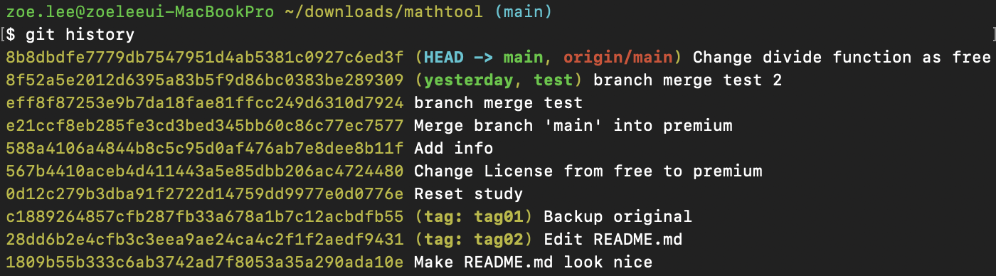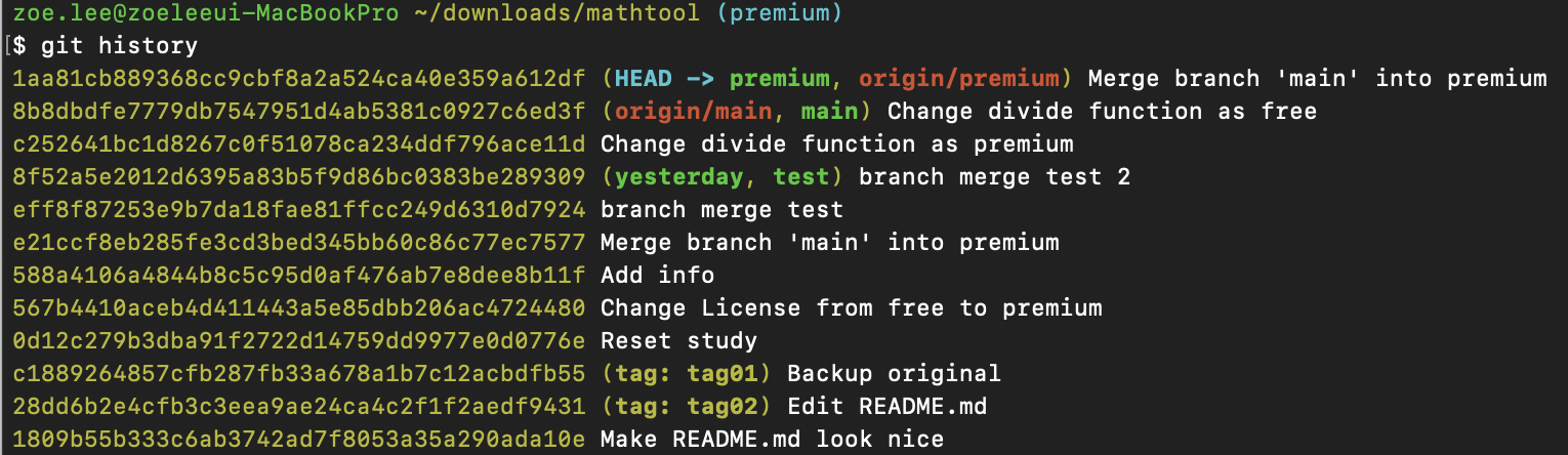 다시 터미널로 돌아와서 이번에는 premium 브랜치 상태에서 커밋 히스토리를 확인했다. 역시 최신 버전으로 origin이 잘 표시되고 있었다. 여기까지 공부를 하고 나면 HEAD와 브랜치의 관계가 혼란스러운 분들이 계실거라 생각한다. 다음 포스팅에 이어서 정리하도록 하겠다.