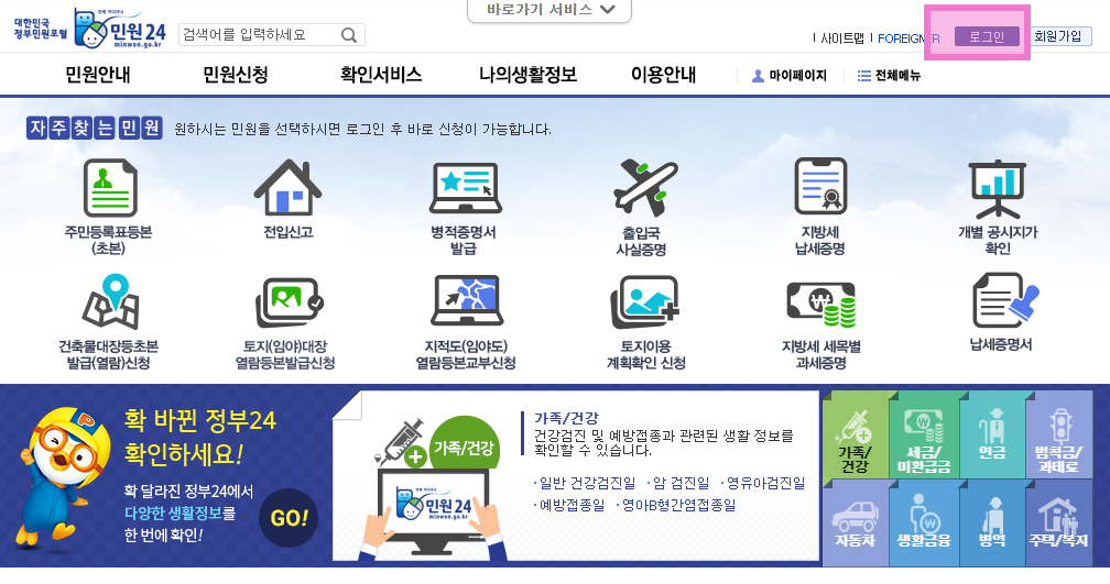 아래 링크를 클릭하여 대한민국 정부민원포털 민원24 사이트로 이동한다. 민원24에서는 주민등록등본(초본), 전입신고, 병적증명서 발급, 출입국 사실증명, 지방세 납세증명, 개별 공시지가 확인, 건축물대장등초본 발급(열람)신청, 토지(임야)대장 열람등본발급신청, 지적도(임야도) 열람등본교부신청, 토지이용 계획확인 신청, 지방세 세목별 과세증명, 납세증명서 등 각종 민원을 처리할 수 있다.