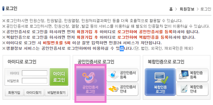 로그인 페이지에서 로그인 방식을 선택한다. 해당 사이트에 가입한 이력이 없더라도 공인인증서를 가지고 있는 대한민국 국민이라면 누구나 로그인이 가능하다.