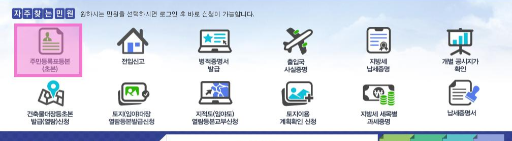 로그인 후 첫페이지의 첫번째 아이콘 주민등록표등본(초본) 아이콘을 클릭한다.