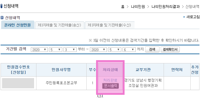 신청내역 페이지로 이동하면 민원접수번호, 민원사무명 등을 확인할 수 있다. 처리상태가 처리완료로 되어 있다면 문서출력 버튼을 클릭하여 인쇄를 진행한다. 주민등록초본 발급도 완료!