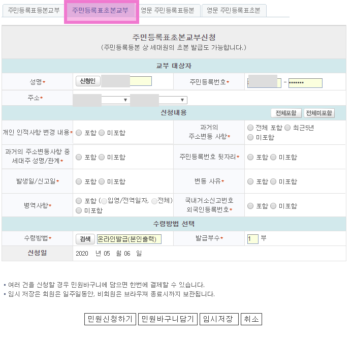 성명, 주민등록번호, 주소지가 제대로 되어있는지 확인한 후에 개인 인적사항, 과거 주소변동사항, 주민등록번호 뒷자리, 발생일/신고일 등 각종 정보들을 표기할 것인지의 여부를 직접 선택할 수 있다. 각 항목을 모두 선택했다면 하단의 민원 신청하기 버튼을 클릭한다.