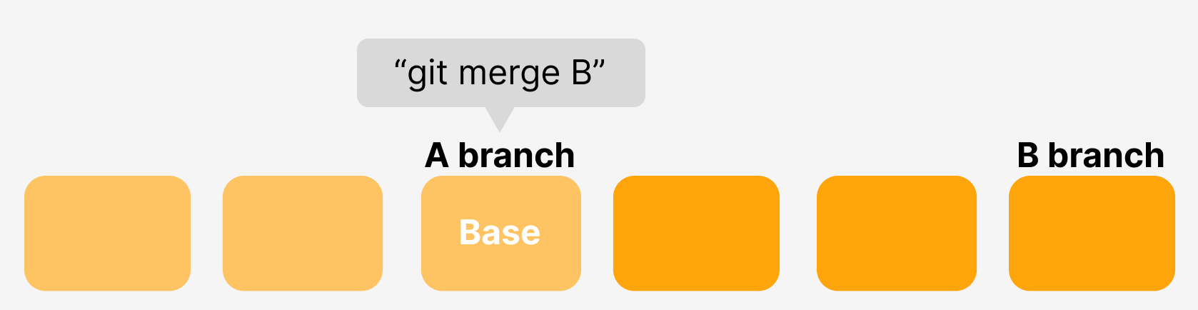 머지는 Base와 비교하여 변화된 부분이 있으면 그것을 우선시하므로, 아래와 같이 A, B 브랜치가 동일한 커밋에 위치하게 된다. (새로운 머지 커밋이 생기지 않음)