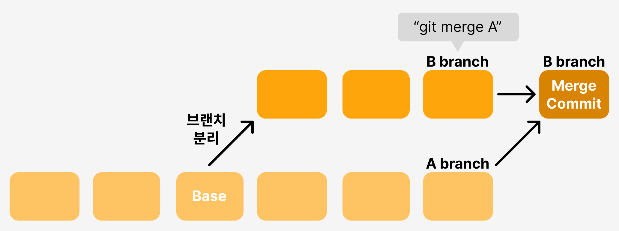 머지는 Base와 비교하여 변화된 부분이 있으면 그것을 우선시하므로, 아래와 같이 A, B 브랜치가 동일한 커밋에 위치하게 된다. (새로운 머지 커밋이 생기지 않음)