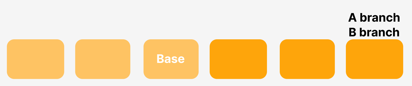머지를 실행했는데 합치려는 브랜치가 동일선상에 있는 경우이다. 브랜치의 가지가 갈라져 나온 시점의 커밋을 Base라고 할 때, A 브랜치와 비교했을 때에는 달라진 부분이 없는데, B 브랜치와 비교했을 때에는 달라진 부분이 있다.