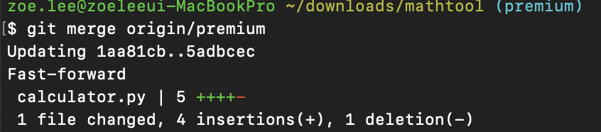 두번째 방법으로 해결해 보도록 하겠다. 내용을 확인했으니 이제 가져온 내용을 로컬 레포지토리의 브랜치에 머지한다. 아래와 같이 git merge origin/premium 명령어를 사용하여 머지를 완료했다.