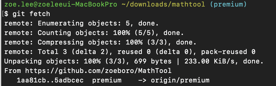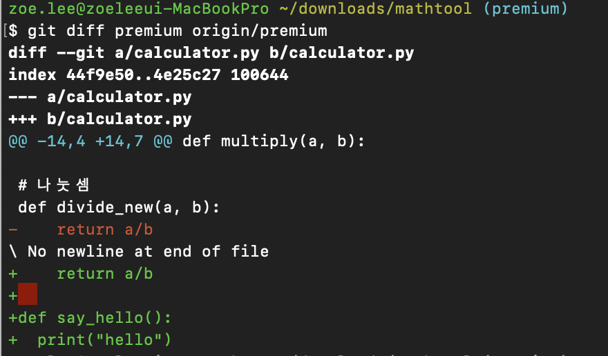 git fetch를 사용하면 리모트 레포지토리 origin/premium 브랜치에 있는 내용이 로컬 레포지토리로 이동한다. 머지는 하지 않은 상태이므로 이제 두 커밋의 차이를 비교해 보기로 한다. 이럴 때에는 두 커밋의 차이를 확인할 수 있는 명령어인 git diff를 사용한다. 이 명령어는 커밋 간의 차이 뿐만 아니라 브랜치 같의 차이를 확인할 때에도 사용할 수 있다. (매우 유용!)