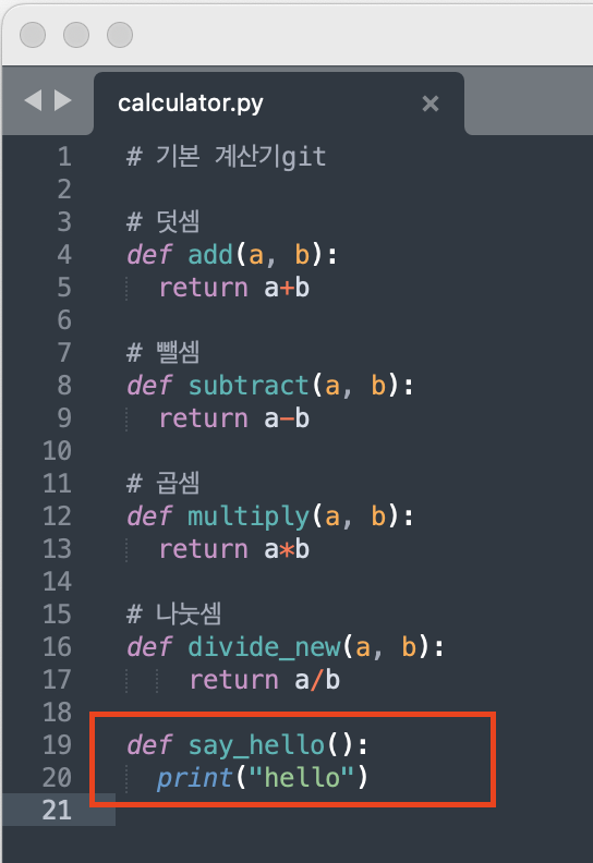계산기 코드가 들어있는 파일인데 아래에 계산기와 전혀 관계가 없는 say_hello 코드를 실수로 추가한 것이다.