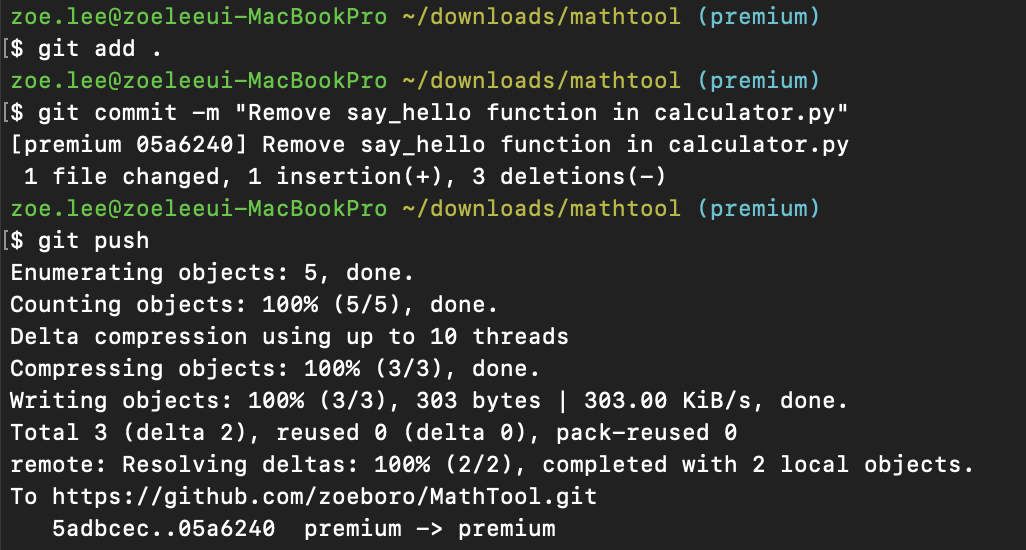 git fetch를 사용하면 리모트 레포지토리 origin/premium 브랜치에 있는 내용이 로컬 레포지토리로 이동한다. 머지는 하지 않은 상태이므로 이제 두 커밋의 차이를 비교해 보기로 한다. 이럴 때에는 두 커밋의 차이를 확인할 수 있는 명령어인 git diff를 사용한다. 이 명령어는 커밋 간의 차이 뿐만 아니라 브랜치 같의 차이를 확인할 때에도 사용할 수 있다. (매우 유용!)