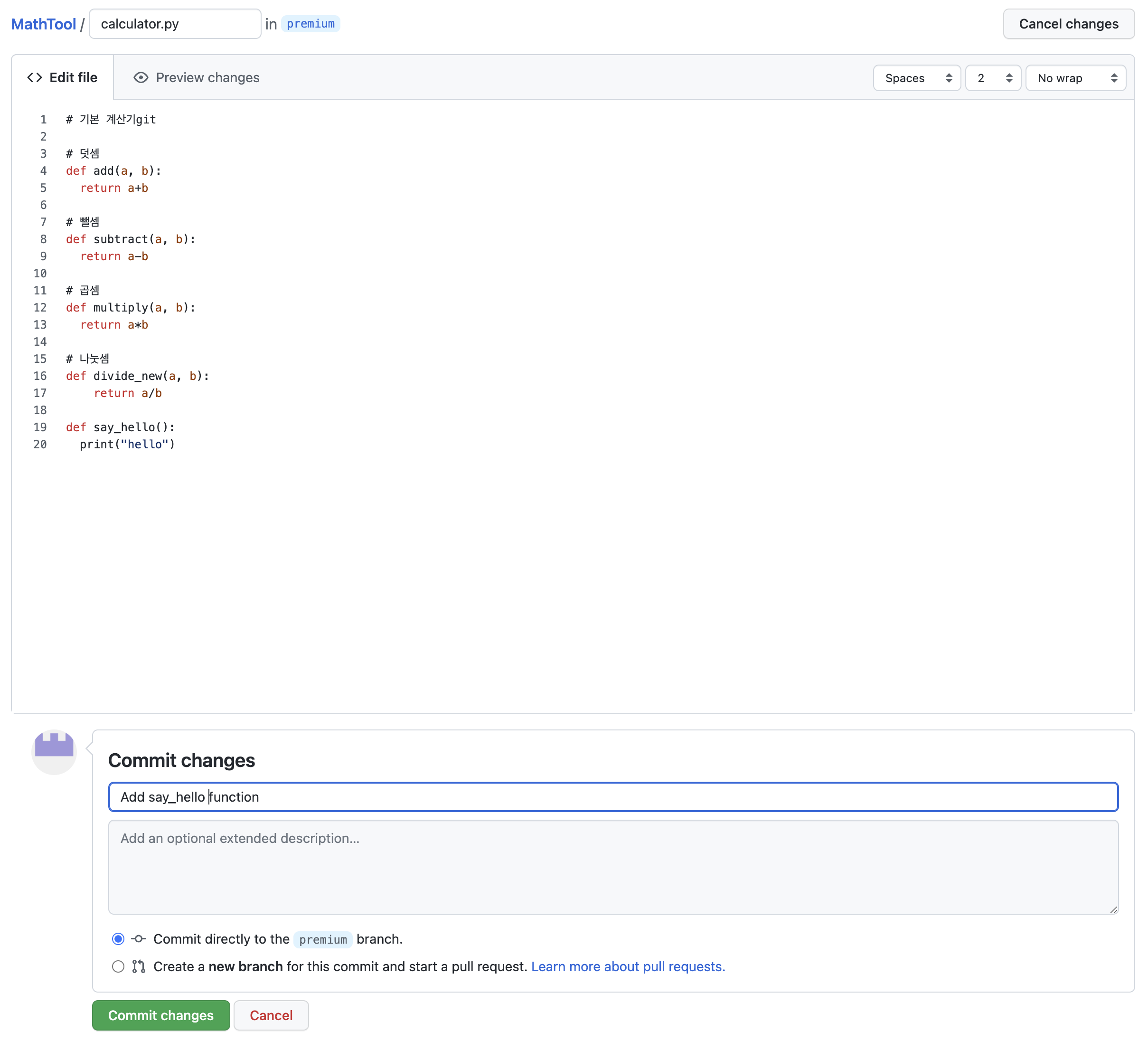 계산기 코드가 들어있는 파일인데 아래에 계산기와 전혀 관계가 없는 say_hello 코드를 실수로 추가한 것이다.