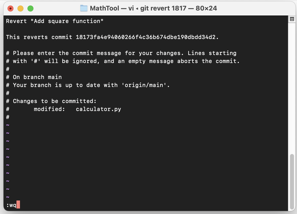 커밋 메세지를 입력하라는 새로운 화면이 나타난다. 원하는 메세지를 다시 작성해도 되고, 기존에 작성된 Revert~로 시작하는 메세지를 그대로 사용해도 된다. 나는 메세지를 그대로 사용하기로 하고 :wq 입력 후 엔터로 내용을 저장했다. 다시 커밋 히스토리를 확인해보니 로컬 레포지토리에 새로운 커밋이 생겼다. 작업한 파일을 열어보니 작업 이전으로 돌아간 것도 확인할 수 있었다.
