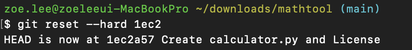 되돌리고 싶은 첫번째 커밋 아이디를 확인한 후에 git reset --hard 1ec2 라는 명령어를 실행시켰다.