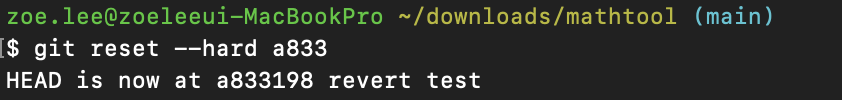 아까와 동일한 방법으로 reset 명령어를 사용하고 커밋 아이디만 바꾸어 주면 된다. 위와 같이 git reset --hard a833 이라고 명령어를 쓰고 실행시키면 HEAD is now at a833198 revert test 라는 문구와 함께 순식간에 버전이 복구된다.