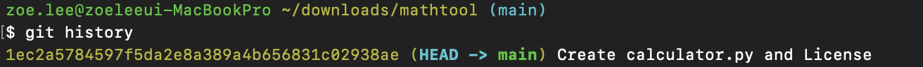 먼저 아직까지 한 커밋리스트를 살펴 보았다. git reset 되돌리는 방법을 설명하기 위해 일단 첫번째 커밋인 Create calculator.py and Lisence 으로 돌아가보도록 하겠다. (테스트를 하면서도 되돌리는 걸 실패할까봐 무서운 코린이...😦)