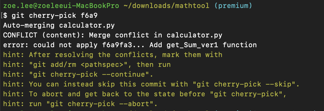 그 다음 git cherry-pick f6a9 라는 커맨드를 실행했다. 그러면 컨플릭트(conflict)가 발생하는데 해결방법은 다른 컨플릭트와 동일하다.