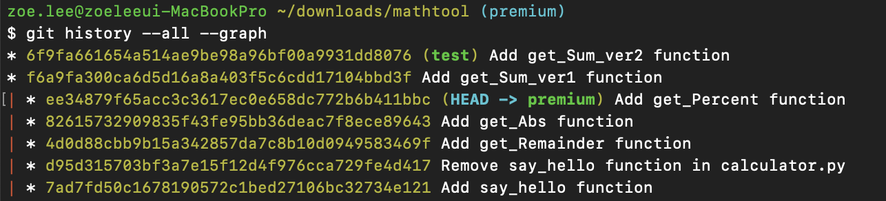 충돌이 발생한 코드를 알맞게 수정한 후 다시 Staging Area로 옮기고 커밋해서 마무리! 내가 원하는 코드만 premium 브랜치로 잘 옮겨진 것을 확인할 수 있었다.