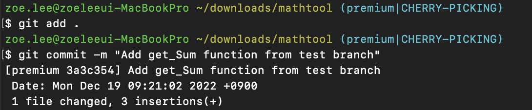 test 브랜치에서 두개의 작업을 수행하고 각각 커밋했다. (커밋 순서 : Add get_Sum_ver1 function → Add get_Sum_ver2 function) 그리고 나서 다시 premium 브랜치로 이동해서 test 브랜치를 합치려고 했는데(머지) 두번째 커밋은 반영하지 않고 첫번째 커밋만 반영해야 하는 상황이 되었다.