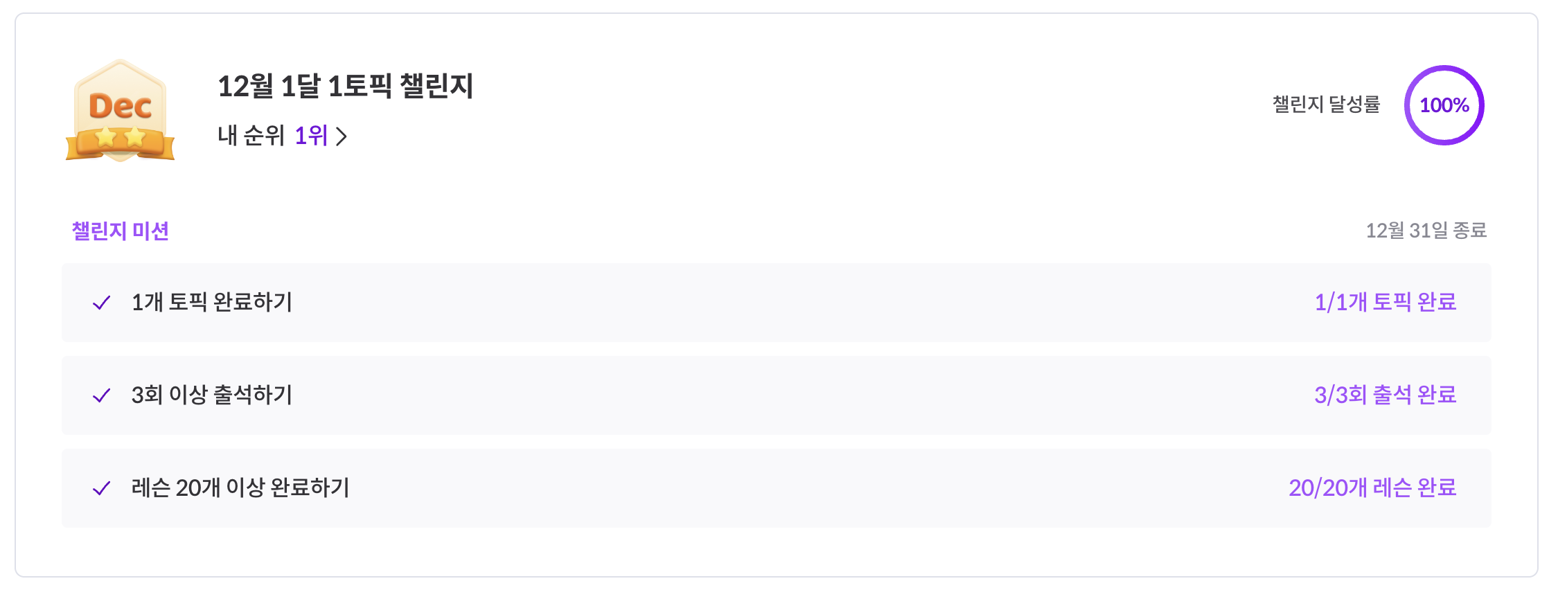 git 공부 외에 나머지 것들은 모두 현재 진행중이거나 아직 시작도 못한 것들인데, 벌써 12월이 10일밖에 남지 않아서 목표를 달성하지는 못할 것 같다. 그래도 시간 내어 조금씩 듣던 강의가 끝났고, 나는 이제 git을 할 줄 아는 사람이 되어 뿌듯하다.