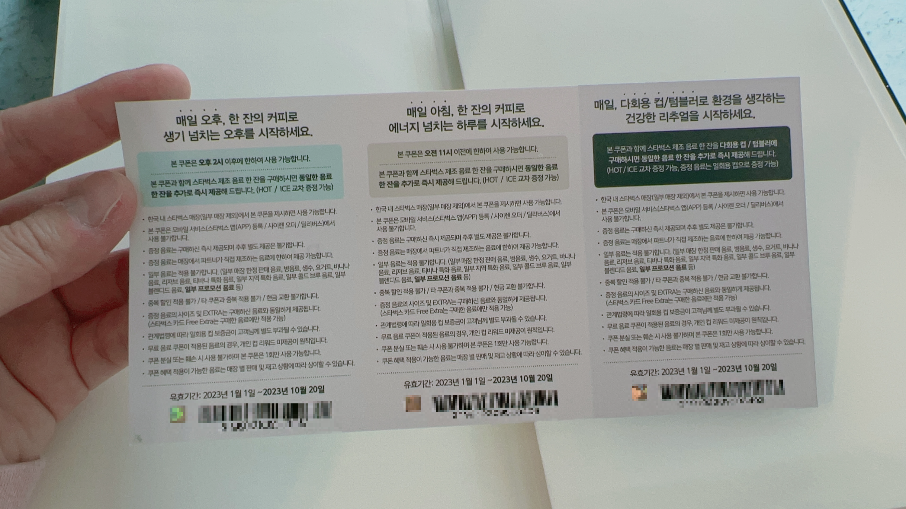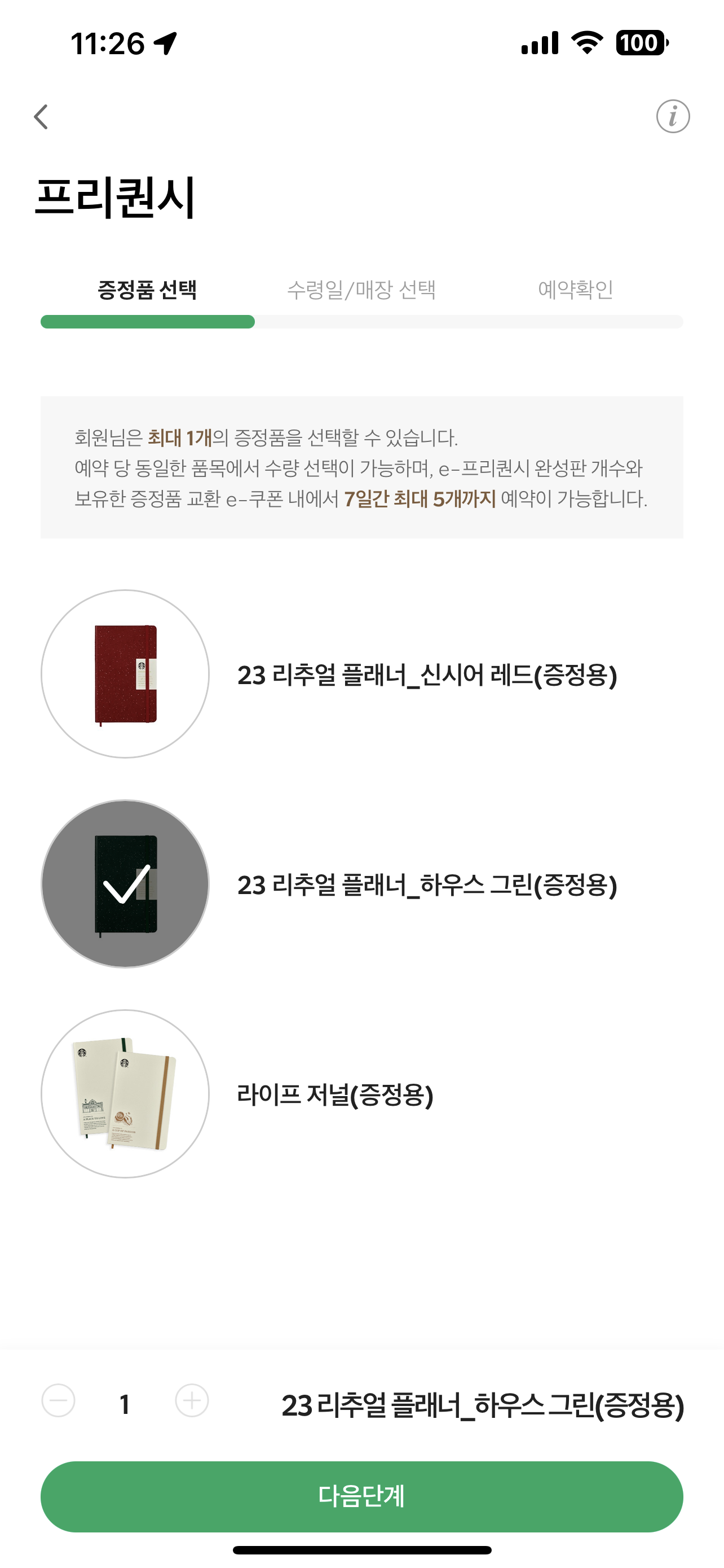 스타벅스 굿즈를 좋아하지만 왠지 이번에는 못 받을 것 같아서 체념하고 있었는데... 아니 이렇게 좋을 수가? 그런데 이제는 증정품을 당일 예약으로만 수령할 수 있다고 한다. 오늘 오전 7시에 알람을 맞춰놓고 일어나서 가까운 스벅 매장에 예약을 할 수 있었다. 그리고 점심시간에 가서 다이어리를 가져왔다.