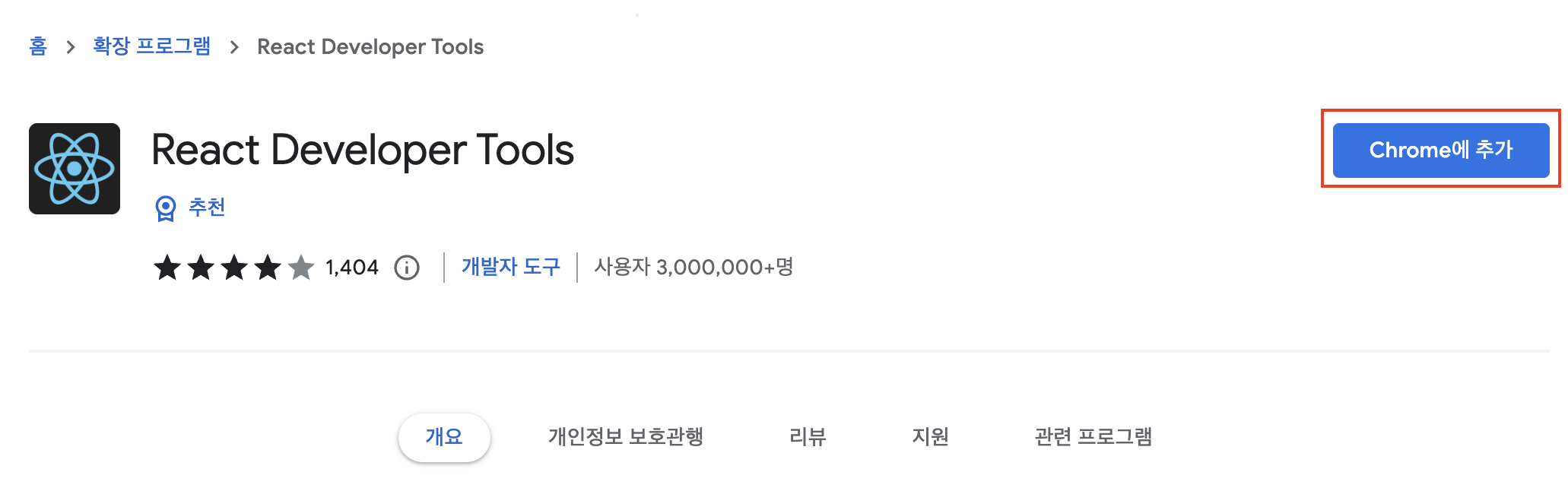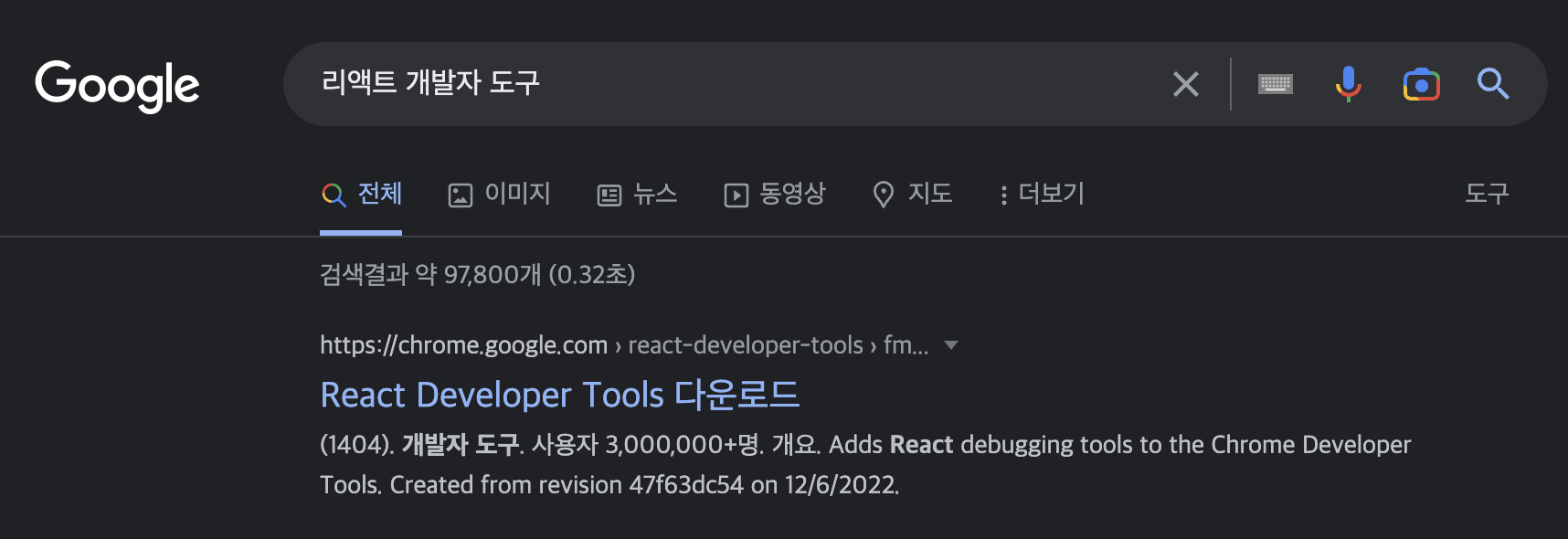 구글 검색 포털에서 '리액트 개발자 도구'라고 검색하면 아래와 같은 사이트를 발견할 수 있다. 리액트 개발자 도구 대신에 'React Developer Tools'라고 검색해도 된다.