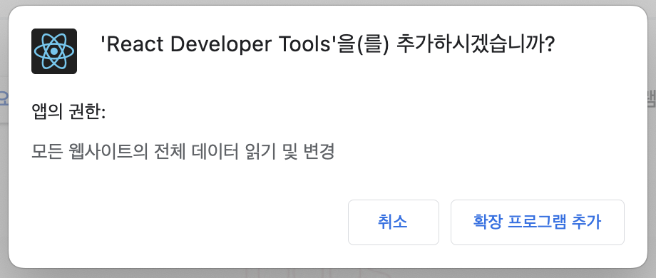 React Developer Tools의 추가 여부를 한 번 더 묻는 팝업창이 뜨는데 이것도 '확장 프로그램 추가' 버튼을 클릭한다.