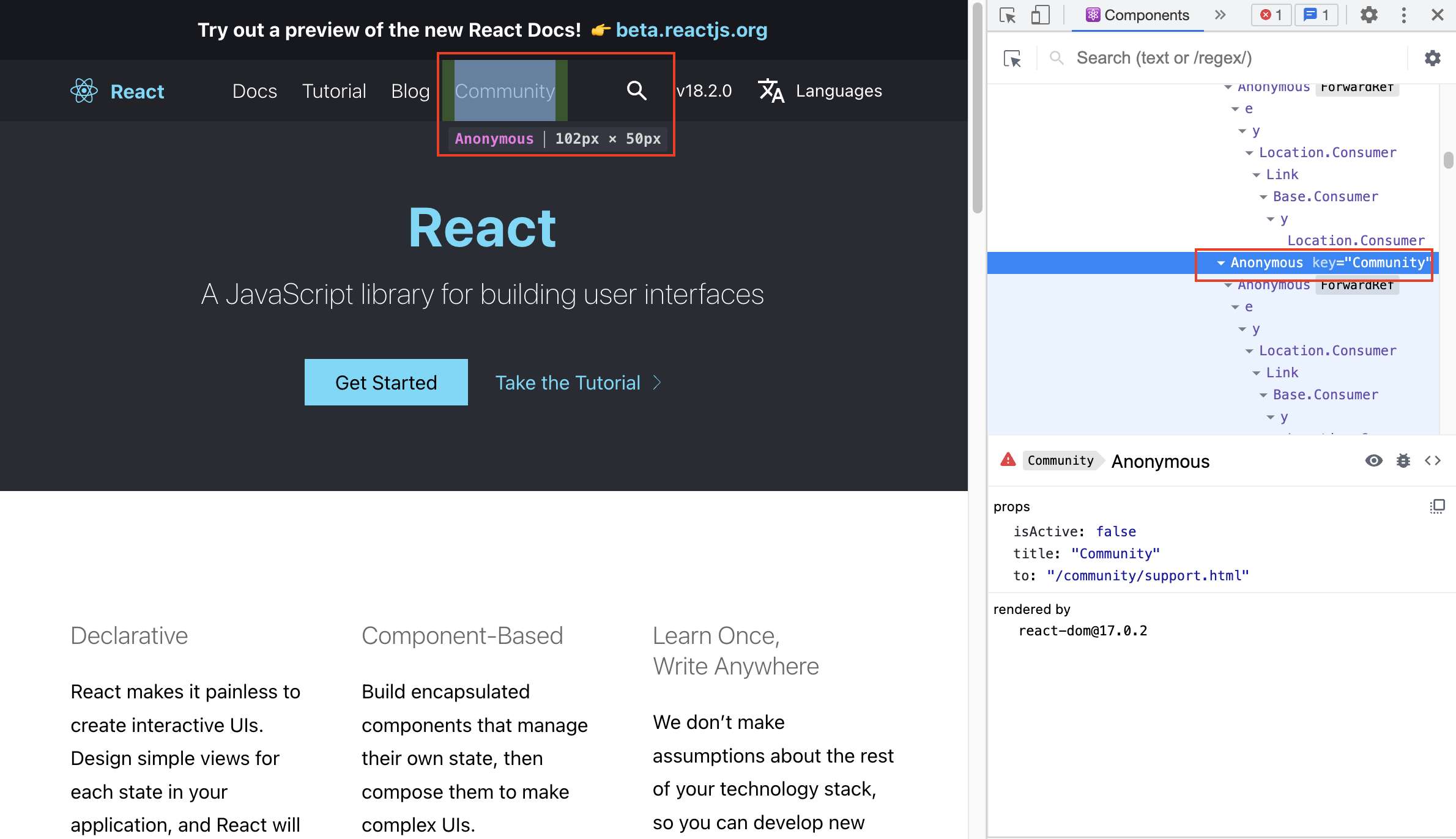 Components 탭 메뉴를 선택하면 어떻게 보이는지 살펴보기 위해서 리액트 웹사이트로 이동했다.