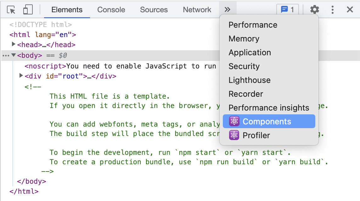그 다음 크롬 브라우저 새로고침 > 개발자 도구를 실행(만약 이미 실행된 상태라면 닫았다가 재실행)하면 Components, Profiler 라는 탭 항목이 추가로 생성되어 있는 것을 확인할 수 있다. 이것은 리액트로 만들어진 페이지에서만 나타난다.