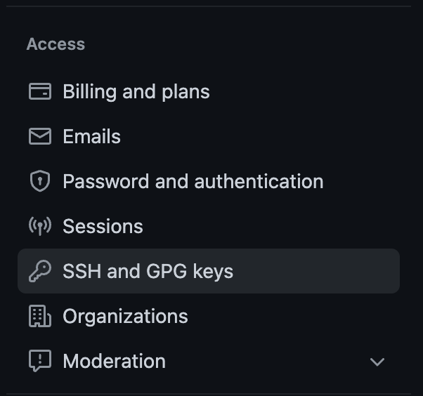 Settings 화면의 좌측 카테고리 중에서 Access > SSH and GPG keys를 선택한다.