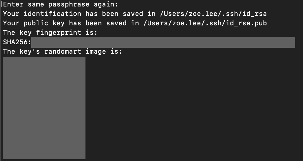 Enter file in which to save the key (/User/zoe.lee/.ssh/id_rsa): 라는 문구가 나오는데, 그대로 엔터키를 누르면 된다.