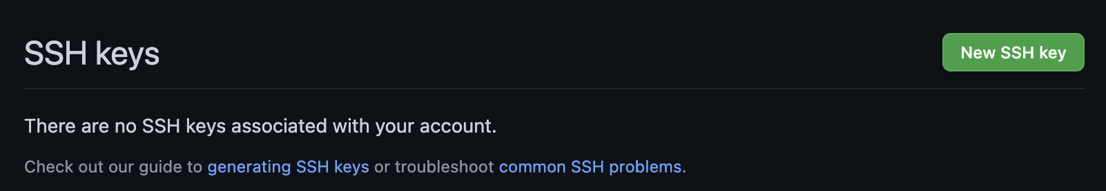 SSH and GPG keys 화면에서 첫번째에 위치한 SSH Keys를 등록해주어야 한다. New SSH Key 라고 쓰여있는 초록색 버튼을 클릭한다.