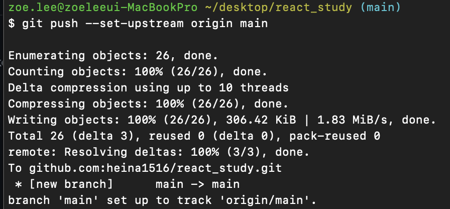 다시 터미널로 돌아와서 git push --set-upstream origin main 커맨드를 실행했더니 로컬 레포지토리에 있던 파일들이 깃허브에 정상적으로 업로드되었다.