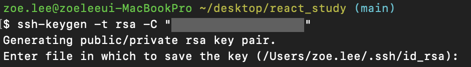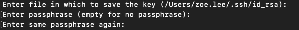Enter file in which to save the key (/User/zoe.lee/.ssh/id_rsa): 라는 문구가 나오는데, 그대로 엔터키를 누르면 된다.