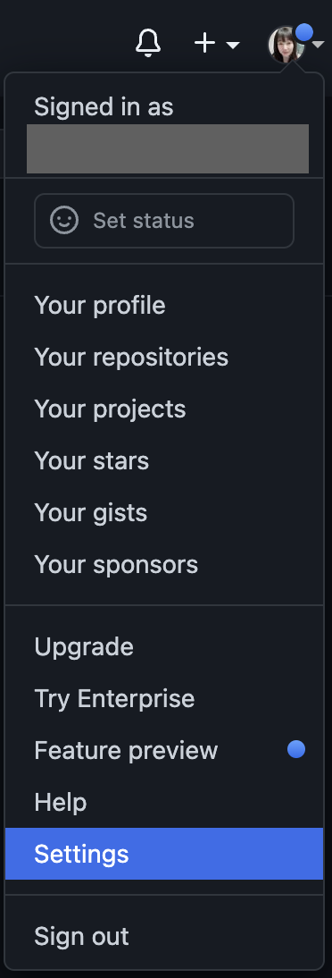 깃허브 사이트로 이동한 후에 로그인한다. 우측 상단 프로필 이미지를 클릭한 후에 Settings를 선택한다.