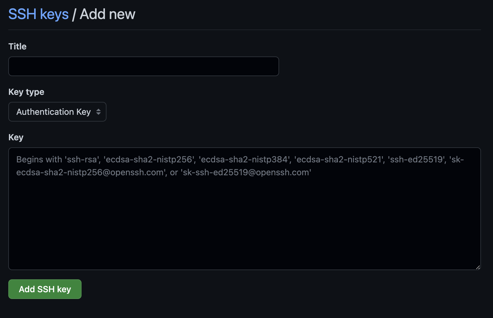 Title에는 적당한 제목을 넣어 주고, Key type은 Authentication key 그대로 유지한다. Key 부분에는 PC에서 생성한 SSH Key 번호를 입력해 주어야 한다.