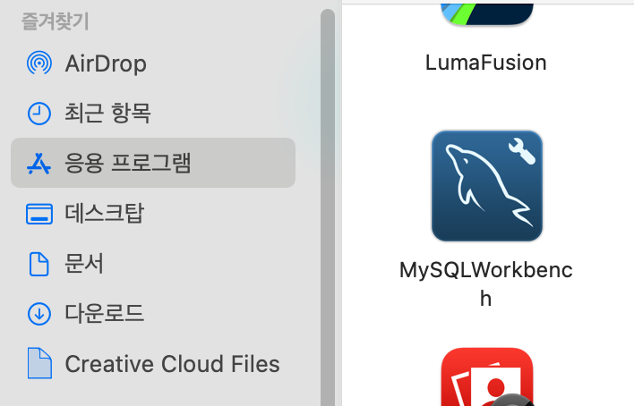 그 다음 Finder 아이콘을 클릭하여 응용 프로그램 폴더로 이동하면, MySQLWorckbench가 설치된 것을 확인할 수 있을 것이다.