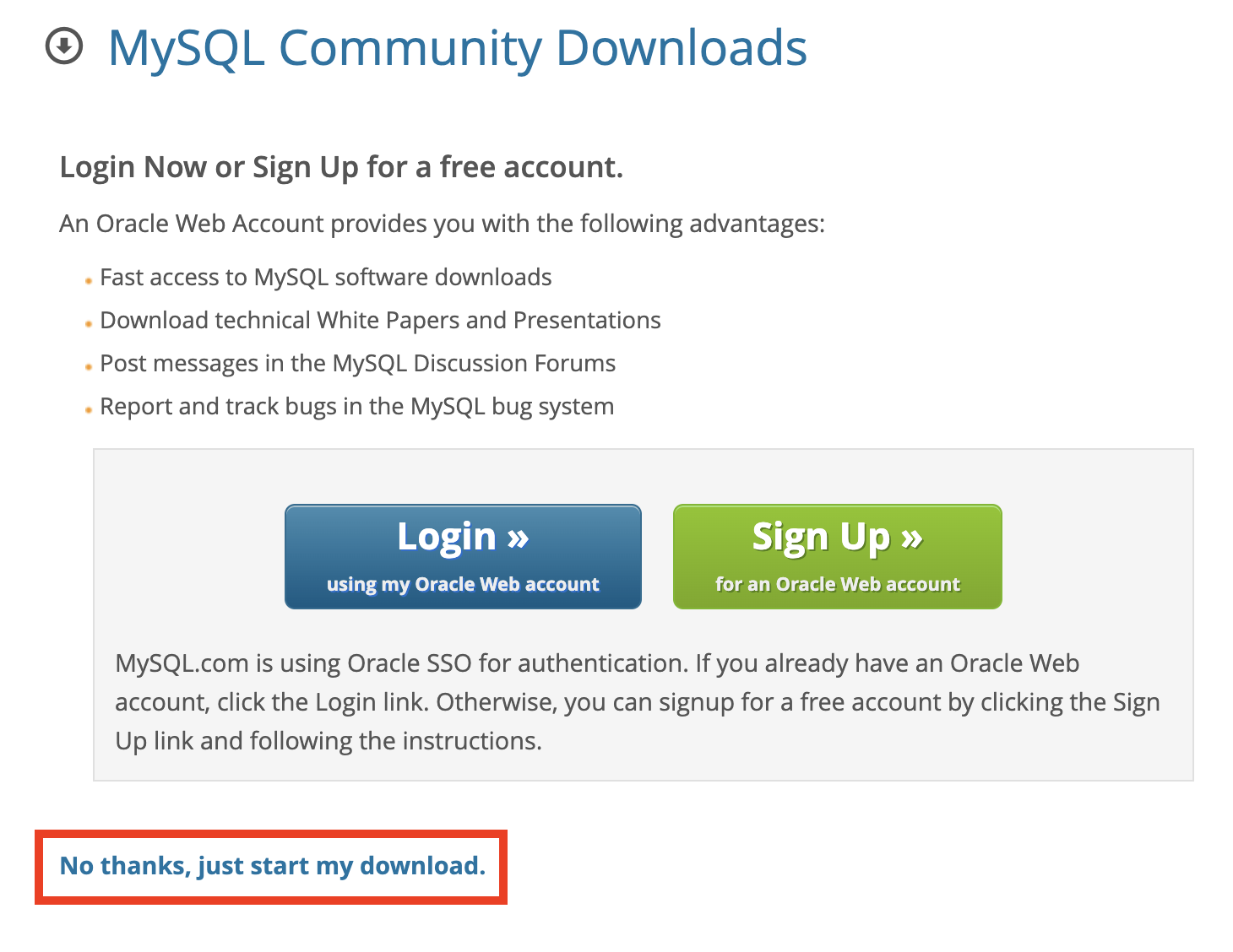 버전을 확인했다면 Download 버튼을 클릭한다. 그러면 아래와 같이 오라클에 회원가입하라는 화면이 나온다. 우리는 회원가입을 하지 않고 진행할 것이므로 하단의 No thanks, just start my download를 선택한다.