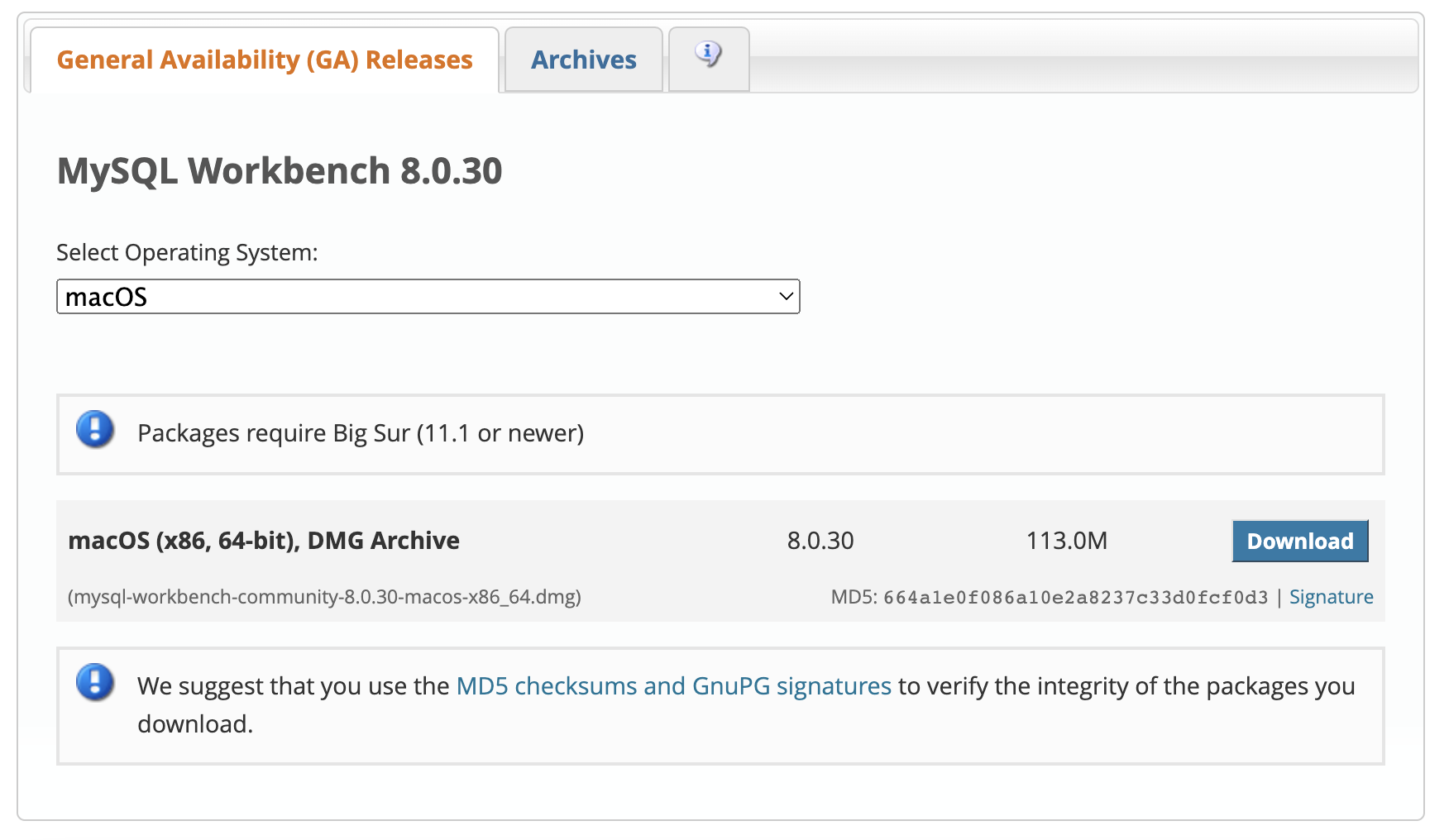 cf. 본인의 macOS 버전이 Big Sur 11.1 보다 이전 버전이라면 Archives 탭을 선택하여, 자신의 macOS 버전에 맞는 것을 다운로드 해야 한다. General Availability (GA) Releases 에서 추천하는 설치파일은 특정 버전 이상의 macOS 에서만 문제 없이 작동하기 때문이다.