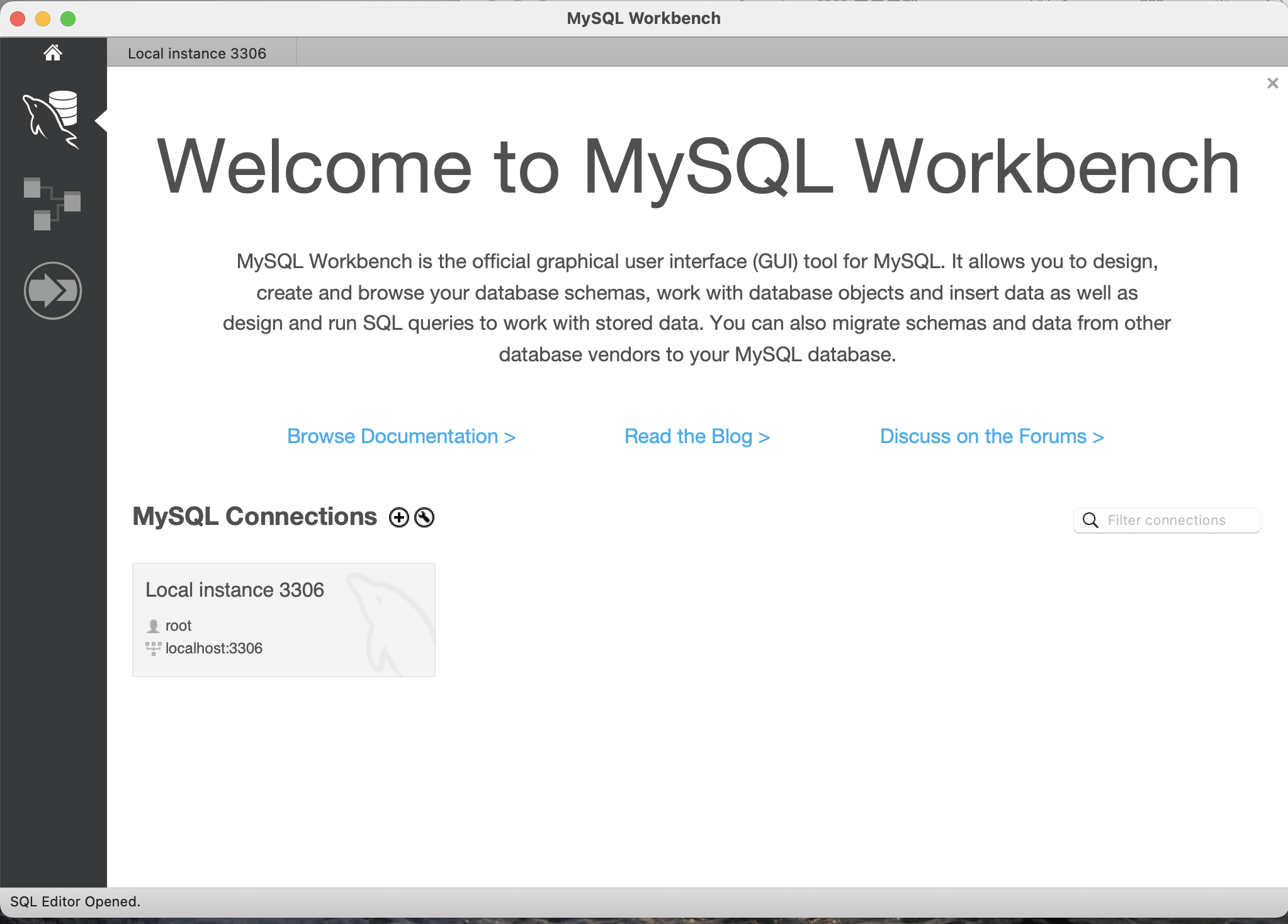 아래와 같이 Welcome to MySQL Workbench 라는 메세지와 함께 프로그램 화면이 실행된다면 제대로 설치된 것이다.