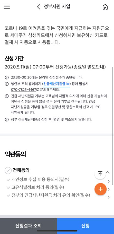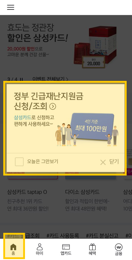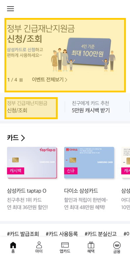 나는 평소에 삼성 신용카드를 주로 사용하기 때문에, 삼성카드에 충전하는 방식으로 긴급재난지원금을 온라인 신청했다. 모바일에 삼성카드 앱이 설치되어 있다면 정말 편리하게 신청이 가능하여, 그 방법을 소개하도록 하겠다.