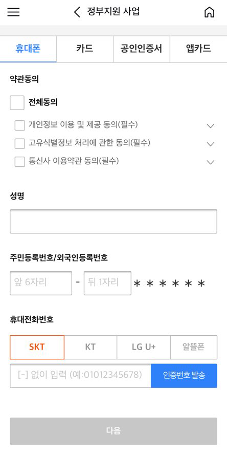 5. 휴대폰, 카드, 공인인증서, 앱카드 중 1가지를 선택하여 본인 인증한다. 나는 어차피 모바일이므로 휴대폰 인증을 선택하여 진행했다. 인증 후에 다음 버튼 클릭!