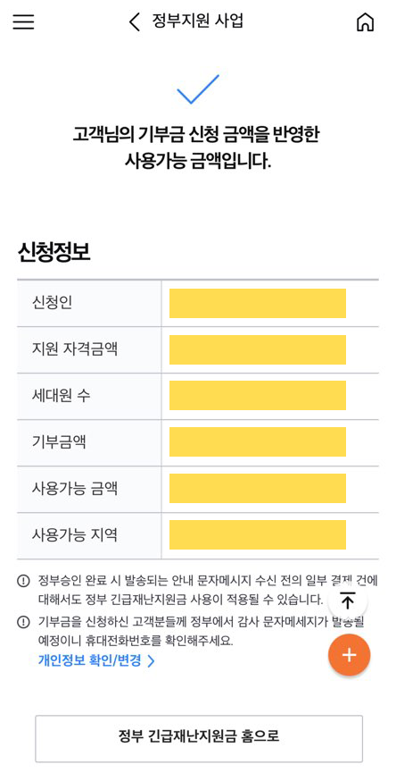 6. 신청인, 지원 자격금액, 세대원 수, 사용가능 금액, 사용가능 지역 증을 확인 하고 완료 버튼을 누른다. ★중간에 기부금액을 입력할 수 있는 항목이 있다. 기부할 예정이 아니라면 금액을 절대로 입력하지 않도록 주의하자★