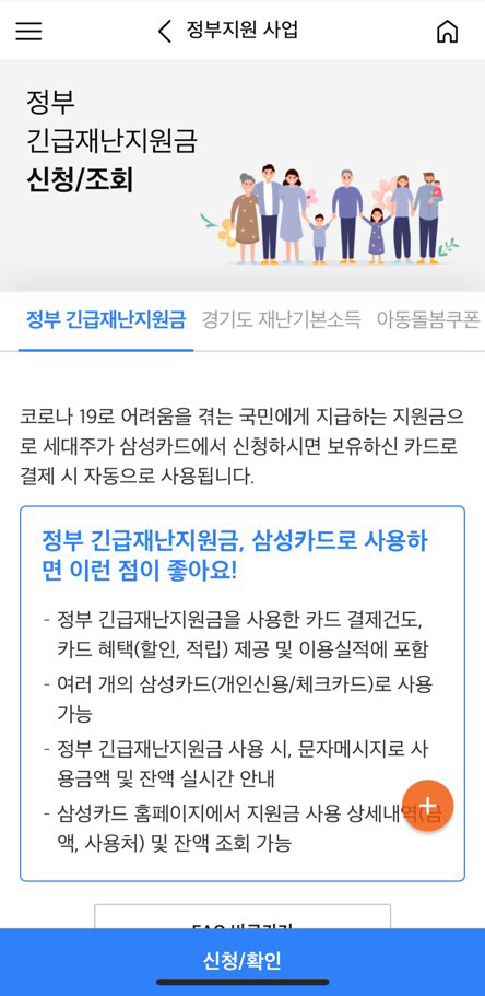 3. 정부 긴급재난지원금 안내사항을 확인하고 하단의 신청/확인 버튼을 클릭한다.