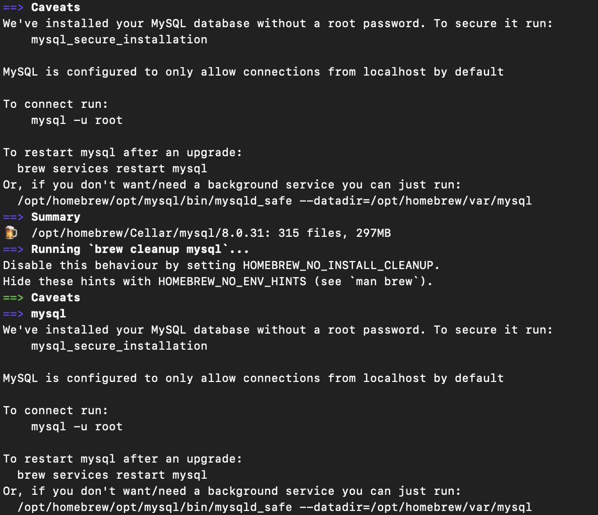 한참을 기다려서 MySQL 설치가 완료되었다. 시간이 좀 걸렸지만 커맨드 하나만 실행하면 자동으로 설치되니 편리하다. 설치를 완료했다면 아래 커맨드를 입력하여 MySQL을 실행해보자.