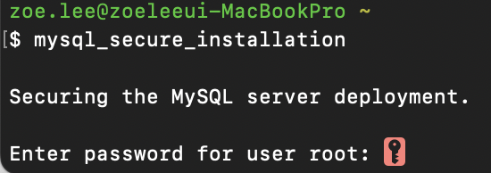 이 같은 문구가 실행된다면 MySQL이 제대로 실행된 것이다. 다음으로 MySQL에 비밀번호를 설정하는 방법에 대해서 설명하도록 하겠다. (비밀번호는 반드시 설정해야하는 것은 아님) mysql_secure_installation 이라는 커맨드를 실행하면 아래와 같이 비밀번호를 설정할 수 있다.