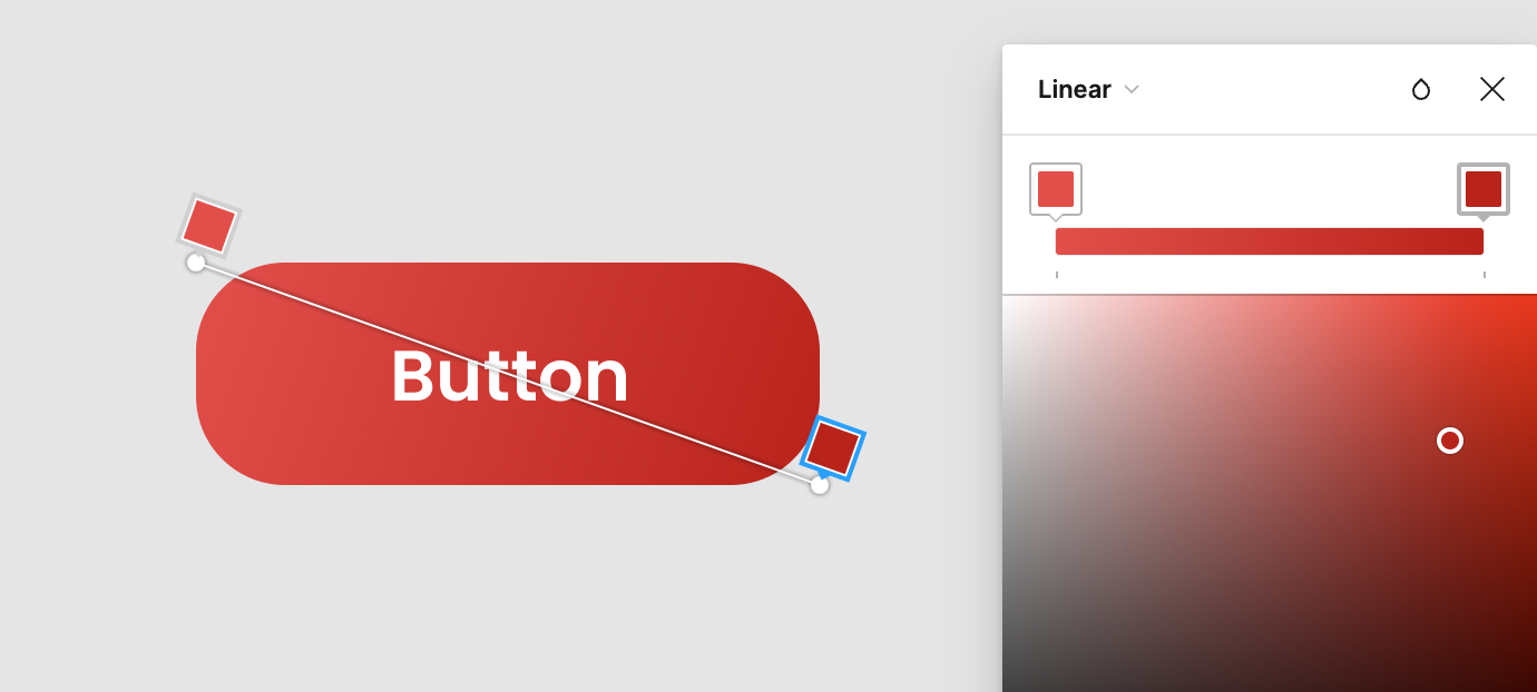 Linear 방향은 대각선으로 설정하고, 왼쪽 위는 기준 색상보다 좀 더 밝게, 오른쪽 아래는 기준 색상보다 좀 더 어둡게 설정한다. 나는 붉은색 버튼을 만들어보기로 했다.