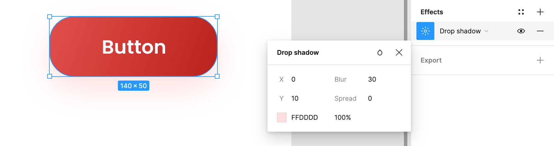 여기까지 했다면 다음은 그림자 효과를 줄 차례이다. 클레이모피즘 버튼에는 내부 그림자 2개와 외부 그림자 1개가 필요하다. 먼저 외부 그림자는 Y축 값과 Blur값을 설정하여 만들어준다. 나는 Y축에는 10, Blur에는 30의 값을 주었는데, 숫자가 커질수록 좀 더 그림자가 넓게 펼쳐진다고 생각하면 된다. 그림자 색상도 버튼과 어울리는 밝고 옅은 색상을 사용했다.