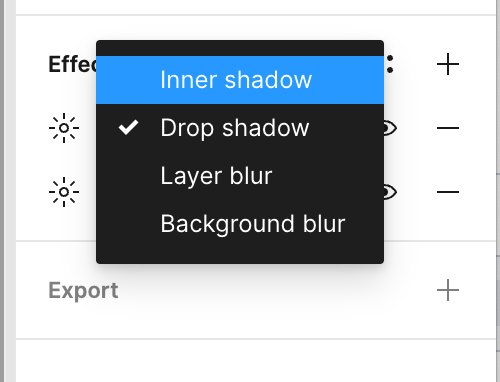 Effects 우측의 + 버튼을 클릭하면 새로운 효과가 생기고 중첩되어 적용된다. Drop shadow가 기본으로 설정되어 있는데 Inner shadow로 변경해주어야 한다.