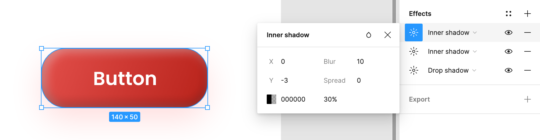 왼쪽 상단에 밝은 내부 그림자가 생겼다. 다음은 오른쪽 하단에 어두운 내부 그림자를 만들어 줄 차례이다. 버튼의 위아래에 같은 깊이감을 주기 위해서 이번에는 Y축에다가 -3의 값을 주었다. (밝은 내부 그림자의 X축에 3을 주었으니까) 그림자 색상은 #000000(검정)으로 설정하고 투명도는 아까보단 낮은 30%로 설정했다.